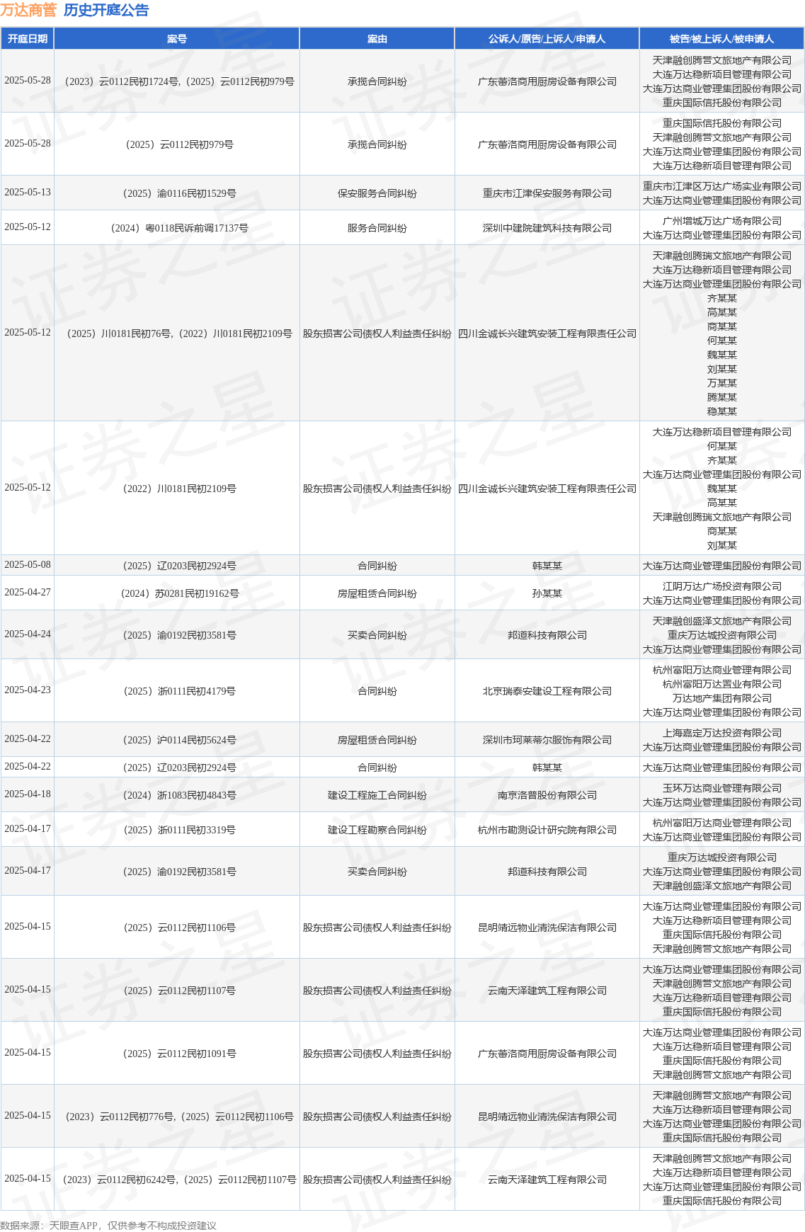 案号:(2025)渝0116民初1529号审理法院:重庆市江津区人民法院案由:保安服务合同纠纷当事人信息: 原告/上诉人:重庆市江津保安服务有限公司 被告/被上诉人:重庆市江津区万达广场实业有限公司、大连万达商业管理集团股份有限公司开庭日期:2025年5月13日根据统计,近一年内以大连万达商业管理集团股份有限公司为当事人的历史开庭公告有107则,其中案由为“建设工程施工合同纠纷”的公告以18则居首,其次为“股东损害公司债权人利益责任纠纷”有10则,“承揽合同纠纷”有10则。历史开庭公告(前20条)如下: